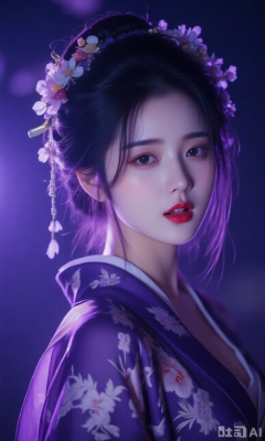 一个古风美女,看向观者,黑头发,发饰,花朵,微张的嘴唇,紫色印花披肩,头花,和服,红唇,写实风格,绣有花纹的和服,夜晚,紫色灯光,