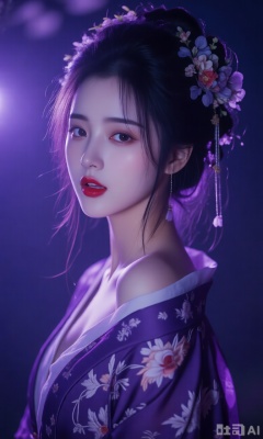 一个古风美女,看向观者,黑头发,发饰,花朵,微张的嘴唇,紫色印花披肩,头花,红唇,写实风格,绣有花纹的和服,夜晚,紫色灯光,