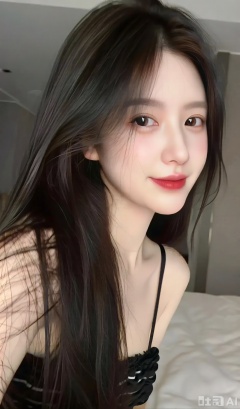 一张有吸引力的亚洲女性的特写照片,长长,直发头发。她的脸庞柔软,皮肤浅,穿着红色唇膏的微妙化妆。她的表情柔和而诱人,略带微笑略微看着一边。她戴着黑色的意大利面条上衣,背景是一个模糊的室内环境,中性音调暗示卧室或客厅。照明柔软自然,突出了她的面部特征。该图像具有高分辨率,逼真的品质,具有浅水深度,可以将注意力集中在她的脸上。