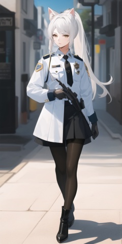 xuanji,1girl,animal ear fluff,white hair,high ponytail,black gloves,long hair,animal ears,high_heel_boots,long hair,looking_up,full body,small breasts,masterpiece,best quality,HDR,UHD,8K,Highly detailed,solo,,(police_uniform:1.3),skirt_suit,(black_pantyhose:1.4),<lora:xuanji-000016:0.7>