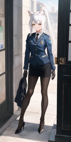 xuanji,1girl,animal ear fluff,white hair,high ponytail,black gloves,long hair,animal ears,high heels,long hair,looking_up,full body,small breasts,masterpiece,best quality,HDR,UHD,8K,Highly detailed,solo,,(police_uniform:1.3),(skirt_suit:1.5),(black_pantyhose:1.4),police_jacket,(blazer:1.3),(pencil_skirt:1.3),<lora:xuanji-000016:0.7>