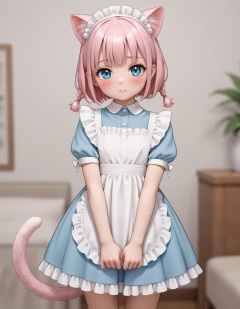 loli,1girl, solo, looking at viewer, blush, short hair, bangs, blue eyes, dress, animal ears, closed mouth, tail, pink hair, braid, short sleeves, cowboy shot, frills, puffy sleeves, cat ears, star \(symbol\), twin braids, puffy short sleeves, cat tail, maid headdress, blue dress, frilled dress, cat girl ,good work, (best quality), illustration, depth of field, (color),masterpiece,best quality,petite,cute,loli, kawaii,
