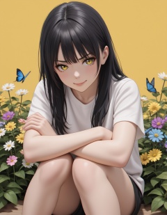 shadow,masterpiece,best quality,good quality,very aesthetic,impactful picture,amazing quality,masterpiece,best quality,fashionable,cool,very aesthetic,ultra-detailed,Elegant and refined,album description,Chromatic Aberration,design,clear lines,huge filesize,depth_of_field,masterful details,intricate details,soothing tones,high contrast,natural skin texture,32K UHD,very fine,texture,extremely fine CG unified 8k wallpaper,exquisite facial features,flower,shorts,solo,white shirt,yellow eyes,black shorts,yellow flower,sitting,purple flower,short sleeves,pink flower,black hair,yellow background,bangs,blue flower,white flower,1girl,yellow butterfly,daisy,long hair,knees up,bare legs,blue butterfly,plant,feet out of frame,leaf,holding flower,crossed arms,(oval face:1.1),(front view:1.2),smile,(solo_focus:1.2),(Horizontal vision),angry,(from_above:0.9),(face_focus:1.2),