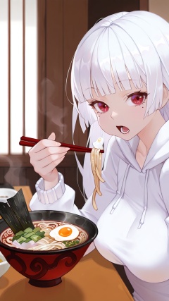 masterpiece,best quality,amazing quality,<lora:dayuexia:0.9>,dayuexia,<lora:oto:0.8>,oto1 style,1girl,solo,long hair,looking at viewer,long hair,1girl,red eyes,white hair,breasts,solo,oto1 style,1girl,food,noodles,chopsticks,solo,ramen,holding,open mouth,long hair,hood,hoodie,mole under eye,mole,bowl,indoors,holding chopsticks,white hoodie,looking at viewer,egg,eating,spoon,long sleeves,hood down,steam,upper body,blunt bangs,table,lower teeth only,