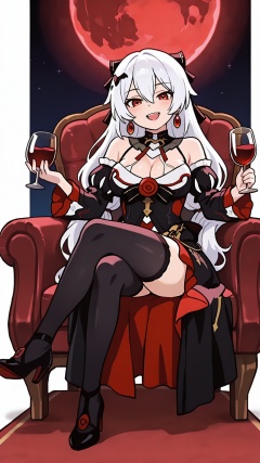 masterpiece,best quality,amazing quality,<lora:dayuexia:0.9>,dayuexia,long hair,1girl,red eyes,white hair,breasts,solo,dayuexia,1girl,red eyes,cup,vampire,solo,thighhighs,crossed legs,flower,red moon,dress,black dress,rose,white hair,wine glass,holding cup,holding,white background,moon,full body,breasts,drinking glass,long hair,red rose,black footwear,jewelry,looking at viewer,sitting,full moon,red flower,high heels,earrings,detached sleeves,couch,black thighhighs,open mouth,simple background,wine,bare shoulders,smile,black sleeves,long sleeves,alcohol,hair ornament,hair between eyes,armchair,cleavage,<lora:chibioo:0.8>,chibio,solo,