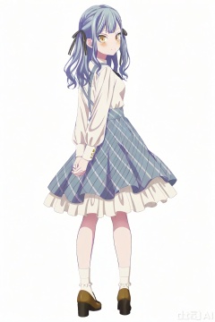 looking at viewer,togawa sakiko,bangs,ribbon,hair ribbon,black ribbon,two side up,blue hair,grey hair,sidelocks,blunt bangs,yellow eyes