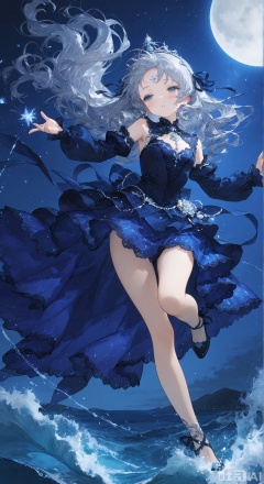 The super Q version of the girl is a delicate and delicate ornament, leaning lazyly on the base of the moon, with a head and body ratio of 1:1.2, showing a lazy and leaning against the waves like a wave. Her hair is fluffy and long curly, with a texture similar to a silk ribbon, with a warm texture and layering. It is a flexible and natural soft ceramic resin texture, which fits the mysterious and gorgeous theme. The delicate air bangs on the forehead, and the ends of the hair are naturally curled. The hair is embellished with silver iris and crescent-shaped silver jewelry, showing mysterious and elegant. The makeup on the face is made of gorgeous and mysterious, with slender crescent eyebrows, and the eyeshadow is gradiently stained with dark blue and silver gray. The blush is cool to light blue and purple, and the fine stardust sequins are added to enhance the atmosphere. The eyes are slightly drunk and raised eyes, with slender upturned eyelashes, and the edges of the eyelashes are dark blue gradient. , the pupils are hand-painted gradients with mysterious star dots embellished, and the mouth is lightly pursed with slender curves and cool colors; the clothing is a gorgeous skirt with blue and black main tone, iris pattern and lace