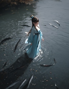 masterpiece,best quality,amazing quality,very aesthetic,absurdres,newest,(dino_(dinoartforame):0.3),(yoneyama mai:0.7),(quasarcake:0.5),from_above,1girl,gui_zhong,hanfu,standing by the river,there are many fish in the river,bright light and shadow,transparent river water,willows,