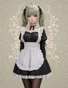 1girl, solo, breasts, looking at viewer, bangs, long sleeves, dress, bow, ribbon, twintails, closed mouth, green eyes, hair ribbon, flower, ahoge, pantyhose, cowboy shot, frills, green hair, puffy sleeves, apron, black dress, black pantyhose, maid, black ribbon, black bow, arms behind back, cat, frilled dress, juliet sleeves, white apron, :<, floral background, black cat