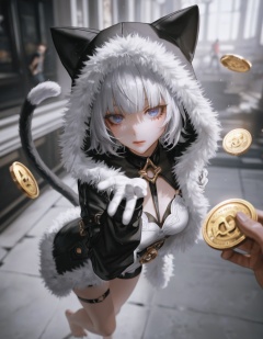 Sophie \(honkai_star_rail\),Depth of field,light particles,lens flare,(artist: quasarcake:0.8),extreme aesthetic,(wrop:0.6),wanke,rella,wanke,masterpiece,best quality,good quality,new,year 2024,year 2023,very aesthetic,absurdres,Visual impact,Electromotive force,perspective composition,a shot with HD,ultra-high resolution,32a-high,best quality,masterpiece,Emotionalization masterpiece,unconventional supreme,masterful details,with a high-end texture,in the style of fashion photography,(Visual impact:1.2),giving the poster a dynamic and visually striking appearance,impactful picture,official art,colorful,splash of color,movie perspective,masterpiece,best quality,amazing quality,very aesthetic,absurdres,best quality,good quality,new,best quality,cowboy shot,looking at viewer,solo focus,face focus,eyes focus,dynamic angle,barefoot,solo,1girl,cat ears,white hair,mischievous,pinching a gold coin,glowing gold coin,cattail,beautiful legs,blue eyes,gloves,foot,Sophie \(honkai_star_rail\),grey hair,cat hood,cat tail,blue eyes,cat ears,