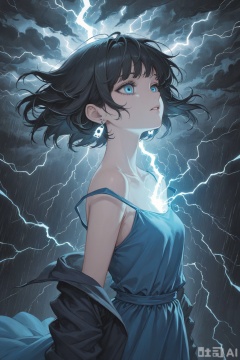 ,(thunderstorm theme:1.3),1girl,1girl,Bangs, off shoulder, black hair, blue dress, blue eyes, chest, earrings, dress, earrings, floating hair, jewelry, sleeveless, short hair,Looking at the observer, parted lips, pierced,energy,electricity,magic,
