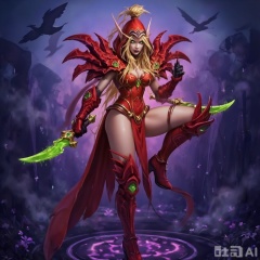 Valeera Sanguinar stands poised in a mystical realm of deep violet and swirling mist, her form illuminated by the glow of her radiant crimson armor and gleaming green blades. Her long golden hair flows freely beside her face, complementing the determined gleam in her golden eyes. She wears her iconic attire—a detailed red breastplate adorned with metallic silver patterns, matching armored gauntlets, and a flowing scarlet cloak embroidered with intricate silver filigree that billows behind her. In her hands, she holds twin curved blades shimmering with vivid green energy, highlighting her readiness for battle.