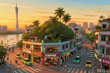 治愈系插画,广州街角,黄昏,咖啡厅色彩鲜艳,屋顶棕榈树繁茂,车辆行人穿梭,远处广州塔与江面构成城市景观,充满活力。