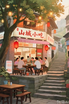 治愈系插画,山城小巷,店铺挂着红灯笼,招牌写着“山城小吃”,食客围坐用餐,石阶通向深处,大树枝叶繁茂,灯光柔和,充满烟火气。光线柔和地勾勒出餐厅的轮廓。渲染用数码手绘的方式,线条流畅且带细微肌理,让餐厅的砖墙、门口悬挂的红灯笼都有真实触感。色彩上,暖橘、浅粉与米白过渡自然,搭配木质桌椅的深棕色,层次分明又和谐。