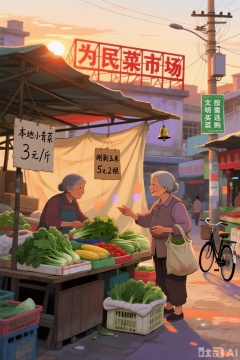 展现市井气息浓厚的傍晚菜市场:商贩收拾新鲜蔬菜,摊位上方挂着手写纸牌,“本地小青菜3 元/ 斤”“刚剥玉米5 元2 根” 字迹鲜活;老奶奶提布兜和摊主还价,远处“为民菜市场” 红色铁制招牌在夕阳下泛暖光,电线杆贴着“文明买菜按需选购” 绿色标语,还传来自行车叮铃声。采用治愈系插画风格,用细腻且略带圆润的线条勾勒摊位帆布的褶皱与蔬菜轮廓,避免生硬的直线;柔和夕阳光线洒在帆布上,形成暖橙与浅紫交织的光斑,光斑边缘做了轻微的模糊处理,像透过毛玻璃看到的光影;以数码手绘的细腻质感渲染,色彩过渡自然柔和,没有强烈的明暗对比,翠绿的蔬菜、暖红的招牌、米黄的帆布相互映衬,深褐木质摊位增添温润感。全景构图容纳多样细节,平视视角让画面充满亲切生活感,整体氛围像午后晒过的棉被般温暖舒适。