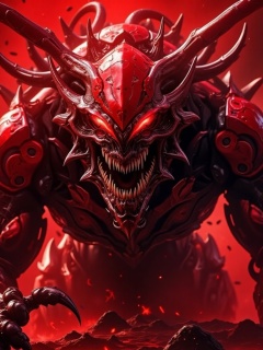 mecha,kk my,a red eyes monster,A horrible,disgusting,humanoid monster is lunging at the camera. Scary scenes,disgusting,scary,bloody,extremely disturbing images,(8K ultra HD, movie texture, ultra high definition resolution, real color, CG picture),((red lava:1.5)),(real texture, rich detail),((transparent colored glaze)),light and shadow,leave blank,