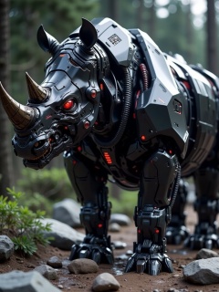 mecha,Mechanical metallic texture,Mechanical metallic texture,This is a sci-fi style image featuring a mechanical black rhinoceros. Its body is composed of black metal and mechanical components,with red glowing devices at the joints and parts of the shell. Its eyes also emit red light,appearing very sharp and intimidating. The mechanical black rhinoceros is located in a forest scene,with the ground covered in rocks and a blurry forest background. This combination of natural environment and mechanical creatures creates a unique atmosphere of integration and conflict between technology and nature,reflecting the imagination of future mechanical creations.,