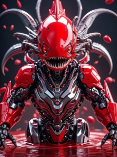 mecha,A full-body shot of a humanoid robot with bright red features resembling a fish, featuring distinct mechanical structures. The robot's forearm is adorned with steel-**** fish fin armor (1.2), and its chest is decorated with fish scale-**** mechanical plates (1.2). Its legs also have fish fin-**** mechanical structures. The robot has glowing red eyes with reflective highlights. Surrounding the circuitry around its body is a swirling red liquid (1.0). The scene is illuminated with vibrant lights and particle effects, with the robot facing directly towards the camera.