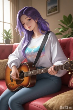 masterpiece,best quality,amazing quality,very aesthetic,high resolution,ultra-detailed,absurdres,newest,scenery,3D,rendered,{Prompt} BREAK depth of field,volumetric lighting,best aesthetic, seraphine twitter, seraphine, 1girl, solo, long hair, looking at viewer, smile, blue eyes, long sleeves, holding, sitting, purple hair, one eye closed, pants, sweater, instrument, guitar, holding instrument, a young woman with long, purple hair sitting on a couch while holding a guitar. She is wearing a tie-dye shirt and appears to be in a relaxed and comfortable setting. The woman is holding the guitar in her lap, and her eyes are closed, possibly indicating that she is enjoying the moment or focusing on her music. The scene conveys a sense of creativity, self-expression, and leisure, as the woman is engaging in her passion for music while surrounded by a cozy and inviting environment.
