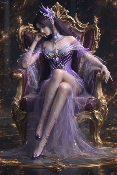A digital artwork of a beautiful,ethereal woman with long,dark hair and pale skin,wearing a flowing,purple,semi-transparent dress adorned with intricate floral patterns and glowing purple accents. a woman's legs in elegant,sheer purple stockings adorned with intricate floral patterns and silver accents,paired with matching high-heeled shoes., She sits in a large, ornate chair with her legs crossed and her left leg resting over her right knee. Her left arm is bent, with her hand resting against her cheek, while her right arm rests on the armrest of the chair. Her posture is relaxed yet confident, exuding an air of authority. The scene is enhanced by dramatic lighting that creates a soft golden glow on her skin and highlights the textures of the chair. Shadows are cast strategically to add depth and contrast, enhancing the luxurious and regal atmosphere of the setting., best quality,astonishing quality,ultimate aesthetics,absurd,best quality,ultimate aesthetics,masterpiece,emotional masterpiece,extraordinary above all,mastery of details,, Negative prompt: ng_deepnegative_v1_75t,(badhandv4:1.2),EasyNegative,(worst quality:2),,nsfw, Steps: 30, Sampler: DPM++ 2M, CFG scale: 3.5, Seed: 4019881743, Size: 1024x1536, Model hash: 062dad72b2, Model: 麦橘超然majicFlus_v1.safetensors, Denoising strength: 0, RNG: CPU, Lora 1: 《金芒逸凤》唯美古风主题风格化lora|摄影|海报设计, Lora Hash 1: 779d600c15, Lora Weight 1: 0.7, Lora 2: MAJICFLUS_麦橘光影约拍, Lora Hash 2: 158a204aee, Lora Weight 2: 0.7, Lora 3: 极致逼真美感模型, Lora Hash 3: 3ef31b4d84, Lora Weight 3: 1.05, vae_name: automatic