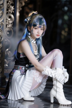 真人写真摄影风格,画面呈现出柔软流畅、超高细节的质感。图中有一位清冷的少女木之本樱,银灰色长发以发饰扎起部分,八字法式刘海,灰瞳,身着苗族盛装、佩戴耳饰和项圈,搭配百褶裙,展现出朦胧美。倾国倾城绝世容颜,长腿白色花边丝袜,白色花边连体手套,白色骑士高跟靴,镜头美学,电影质感,高级感,大师级作品,以特写镜头捕捉细节,展现电影级治愈系的朦胧美学高级感,高级感,获奖作品,8K超高清画质,8K细腻真人皮肤纹理,精致细腻,细节丰富,冷色调,镜头美学,电影质感,高级感,完美品质,大师级作品,35mm1.4f拍摄。背景华丽装饰,真实光影效果,最高画质。