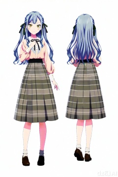 saki type,neck ribbon,plaid skirt,grey skirt,high-waist skirt