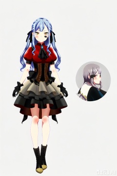 looking at viewer,togawa sakiko,bangs,ribbon,hair ribbon,black ribbon,two side up,blue hair,grey hair,sidelocks,blunt bangs,yellow eyes,Oblivionis type,short sleeves, black gloves,red collared shirt,puffy sleeves, jewelry,black dress,layered skirt, puffy short sleeves,black ascot,gold_trim