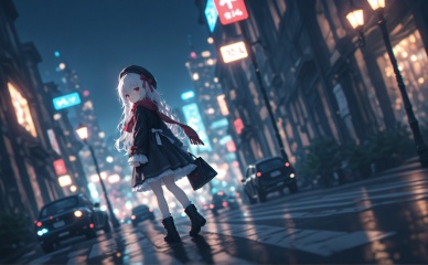 masterpiece,absurdres,best quality,loli,petite,high quality,chromatic_aberration,cinematic_angle,dutch angle, //1girl, solo, long hair, very long hair, white hair, road, black footwear, wide shot, boots, outdoors, night, city, crosswalk, standing, looking at viewer, car, street, cityscape, dress, red eyes, bow, blurry, scarf, building, red bow, ribbon, motor vehicle, looking back, bag, full body, scenery, red scarf, city lights, lamppost, bokeh, black dress, long sleeves, depth of field, skirt, chromatic aberration, black headwear, hair bow, socks, holding, lens flare, smile, sidewalk, wavy hair, black skirt, red ribbon, sleeves past wrists, night sky, hair ornament, hat, frills, holding bag, walking, sign, closed mouth<lora:Fumyun-000030:0.8>
