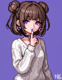 original, brown hair, 1girl, solo, sfw, bangs, choker, blunt bangs, purple background, upper body, jewelry, eyebrows visible through hair, simple background, earrings, purple eyes, parted lips, short hair, long sleeves, white sweater, looking at viewer, sweater, finger to mouth, heart, purple flower, flower, heart choker, heart earrings, purple_eyes, closed mouth, signature, hair bun, long fingernails, nail polish, nail, double bun
