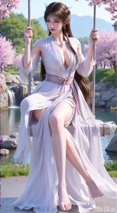 (masterpiece, top quality, best quality, official art, beautiful and aesthetic:1.2),Dynamic posture,(Sitting on the swing:1.39),natural skin texture,(Milky skin:1.2),1gir,solo,long Dress, (Long legs, perfect proportions:1.2),(Sakura, butterfly:1.29),(huge breasts:2.99),(full breasts:2.99),Wisteria, wisteria flowers, castle, waterfall, mountains in the distance,,,XbaifengsongyuYH,Xbigbreasts,Xyueling,Xyueling2,Xyuxin,Xyuxinxianzi
