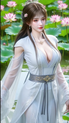 (masterpiece:1.2),best quality,,A woman adorned in traditional Chinese attire,featuring a flowing robe with intricate embroidery and floral accents. A garden filled with pink roses and lush greenery. Soft pastel hues of white,blue,and green,creating a serene atmosphere. Photorealistic photography.(huge breasts:2.99),(full breasts:2.99),,(Background with lotus pond and pink lotus flowers:1.39),Xbigbreasts,XQueenMedusa,Xyueling,Xyueling2,Xyuxin,Xyuxinxianzi