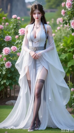 (masterpiece:1.2),best quality,,A woman ,(dress). black Stockings, high heels,,featuring a flowing robe with intricate embroidery and floral accents. A garden filled with pink roses and lush greenery. Soft pastel hues of white,blue,and green,creating a serene atmosphere. Photorealistic photography.,,(huge breasts:2.99),(full breasts:2.99),Xbigbreasts,XQueenMedusa,Xyueling,Xyueling2,Xyuxin,Xyuxinxianzi