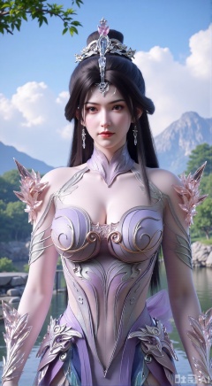 (masterpiece, best quality:1.2),1 girl, solo, long hair, black hair, hair accessories, clothing, cleavage cuts, long dress, jewelry, upper body, earrings. Background is outdoor, sky, clouds, water, trees, architecture, landscape, lantern, mountain, dragon, architecture, bridge, east Asian architecture, fog, pagoda,,(huge breasts:2.99),(full breasts:2.99),XXbaifengsongyuYH,Xbigbreasts,Xyueling,Xyueling2,Xyuxin,Xyuxinxianzi