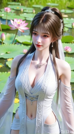 (masterpiece, best quality:1.2),1girl, navel, solo, midriff, bare shoulders, hair ornament,(long hair),(High double ponytail:1.49), red lips, BREAK, (looking at viewer:1.39), chinese clothes,(Holographic long dress:1.36), (lace,Rainbow Gradient Color:1.28), BREAK,blurry, solo focus, long hair, lips, daytime, lipstick, outdoors, standing,upper body,(huge breasts:2.89), background, solo, makeup,(Liquid glass style flowers:1.49),(huge breasts:2.99),(full breasts:2.99),,(Background with lotus pond and pink lotus flowers:1.39),XXbaifengsongyuYH,Xbigbreasts,Xyueling,Xyueling2,Xyuxin,Xyuxinxianzi
