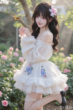 1girl, solo, lolita, long curled black hair with pink bows, hair ornament (crystal butterfly clip), white frilly dress with blue and pink floral patterns, lace-up thighhighs, black mary janes, standing on one leg, holding a parasol, reaching out to a butterfly, soft smile, garden background, blooming roses, sunlight filtering through leaves, 8k, detailed