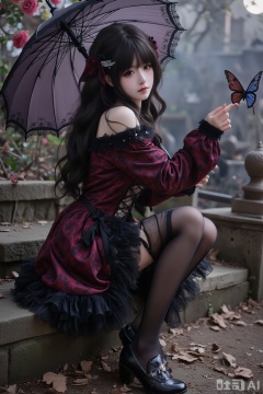 1girl, solo, gothic lolita,black stockings, long curled black hair with dark crimson bows, hair ornament (black crystal butterfly clip with silver accents), black and deep purple frilly dress with ornate lace trim and subtle gothic floral patterns, lace-up thighhighs with ribbon details, black mary janes with cross buckles, standing elegantly on one leg, holding a vintage-style black lace parasol, reaching out towards a mysterious dark-winged butterfly, subtle melancholic smile, gothic garden background with withered roses and thorny vines, moonlight filtering through barren trees, dramatic lighting, 8k, highly detailed, gothic architecture elements in background, faint mist effect, silver jewelry with dark gemstones.