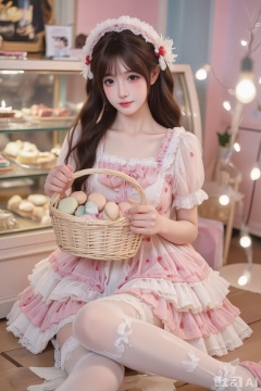 1girl, solo, sweet lolita, strawberry print chiffon dress with layered ruffles and pearl buttons, her long hair is styled with strawberry hair clips, white stockings with lace trim, pink platform loafers, holding a vintage wicker basket filled with macarons, playful wink, pastel-colored bakery background, glass display case with desserts, string lights, soft bokeh effect, 8k, highly detailed.
