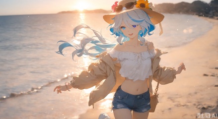 Girl, single, long hair, chest, looking at the audience, smiling, mouth open, blue eyes, skirt, shirt, hat, navel, held, bare shoulders, jewelry, long hair, blue hair, standing, collarbone, jacket, upper body, white shirt, flower, d, colorful hair, outdoor, ruffled, open clothes, shorts, navel, water, off-the-shoulder, belly, bag Arms, bracelets, open jackets, striped hair, crop tops, super shorts, ocean, beach, sunglasses, white shoes, blue shorts, sun hats, hat flowers, hand-worn headwear, Furina