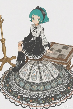 The picture style is illustration, hand-painted illustration style, hand-painted lines, the picture composition is simple and the color contrast is strong. ,In the Gothic visual style, hand-drawn illustrations are adopted, with hand-drawn lines, simple composition and strong color contrast. In the picture, there is a girl with a black retro pan head, green narrow eyes, beautiful sitting posture, wearing an ancient-style skirt with exaggerated ruffles and metal decoration, paired with a white lace top with skirt color pattern. The skirt color is a little gold on the original basis and has fewer patterns. The skirt is placed on a white background, and the side light is touched from the left to enhance the three-dimensional sense. The main color is white. The skirt is slightly to the right in the composition, and there are retro suitcases and old newspapers next to the girl. The overall atmosphere is full of mysterious and unique.