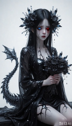 Masterpiece, best quality, ultra-detailed, sharp focus, drgn_stly, stigma_art, 1girl, pale face, sunken eyes, long black straight hair, adorned with "bouquets" made of solidified black crystals and withered petals. She has one eye like a deep night sky, blue in color, while the other is a pure, dark red like dried blood (heterochromia). She wears a complete gothic robe whose surface is covered in black, crystalline "tear tracks". Her eyes no longer shed tears, but instead "weep" "bouquets" composed of tiny, transparent crystals and withered petals. These "flowers" solidify along her cheeks, forming grotesque, continuously growing tear-track bouquets. A "fake dragon bone tail" made of hard, faintly shimmering black crystal aggregates extends from her waist. Its surface has fine cracks, and transparent liquid seeps from these fissures. She is sitting half-length, her hands clenched, her expression pained and vacant.
