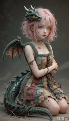 Masterpiece, best quality, ultra-detailed, sharp focus, drgn_stly, stigma_art, 1girl, pale face, hazy eyes filled with naive innocence, messy, cotton-soft pink short hair, with several visible crude stitches in her hair. She has one eye as bright blue as a glass bead, while the other is a murky, old-button-like yellow (heterochromia). She wears a warm, fluffy, "doll-like" dress pieced together from different colored old fabrics, the dress adorned with multiple thick stitches and cute but worn patches. A massive "fake dragon tail" made of soft, fluffy dark green faux dragon scale fabric, adorned with a cute bow at its tip, extends from beneath her dress's hem. This "fake dragon tail" is not directly attached but its base is tightly connected to the inside of her dress by several thick, "vines" resembling rusted metal wires. These vines pierce through the fabric, leaving several red, constricted marks on her waist, from which a few drops of transparent liquid seep. She is sitting sideways, half-length, her arms wrapped around her knees, her eyes filled with fragile innocence and a sense of manipulated cuteness.