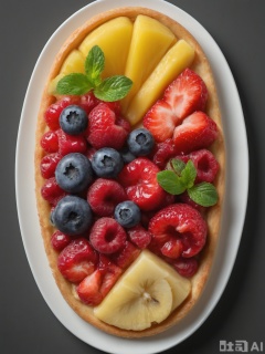 SPLJ, A close-up photograph of a plate of colorful fruit tart, with a crisp pastry crust, a layer of creamy custard, and a topping of fresh berries such as strawberries, blueberries, and raspberries. The tart is cut into slices, and one slice is placed on a white plate, which is set against a simple black background. The lighting is soft, highlighting the juicy texture and vibrant colors of the fruits, making the tart look like a perfect summer dessert.