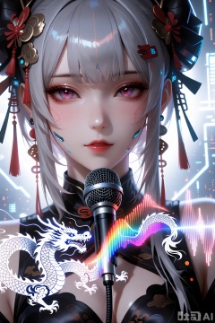 ​虚空歌姬·脉冲​:虚拟歌姬特写,面部融合传统饰物与科技接口,麦克风线变为光束连接虚空,音波可视化为水墨龙形与频谱脉冲。OC渲染,极致细节皮肤质感,背景是抽象的数据深渊,充满发光线条与噪点。