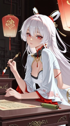 masterpiece,best quality,amazing quality,<lora:dayuexia(qipao)-000020:0.8>,dayuexia\(qipao\),<lora:20250808-1754650692631:0.8>,zhigan3d,1girl,white hair,red eyes,solo,small_breasts,looking at viewer,ruqun,pastel_colors,floral_embroidery,holding_brush_pen,antique_desk,rice_paper_scroll,paper_lantern_light,ink_shading,traditional_chinese_study,white hanfu,