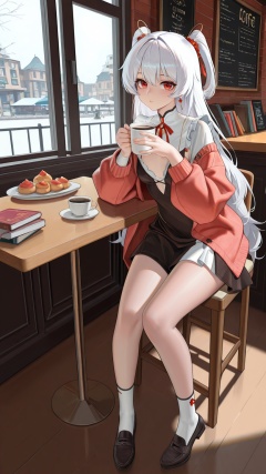 masterpiece,best quality,amazing quality,<lora:dayuexia(qipao)-000020:0.8>,dayuexia\(qipao\),<lora:20250808-1754650692631:0.8>,zhigan3d,1girl,white hair,red eyes,solo,small_breasts,looking at viewer,1girl,cardigan,dress,loafers,holding_coffee,sitting,cafe,table,window,pastry,books,indoors,warm_light,cozy,