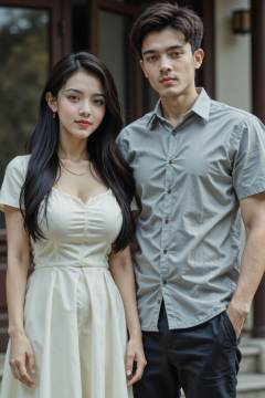 HDR photo of cinematic film still this is a young couple outdoors. The woman with long black hair,wears a light boatneck dress and skirt. The man with short black hair,is in a shirt and pants. Standing in front of the building,