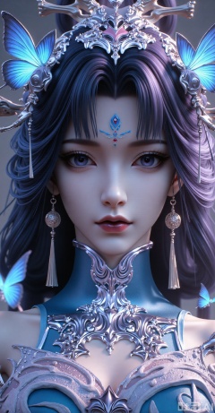 Character: Upper body close-up. Black hair is flowing, delicate skin and delicate makeup. Looking at the camera, long eyelashes, natural pink lips. Special Effects Elements: A large number of blue butterflies surround the character, some staying on the cheeks and forehead, and some flying between the hair. The butterfly's wings are flashing with dreamy light, and the exquisite starlight effect creates an extraordinary atmosphere; the expression facing the camera is very calm, with a hint of desire, giving people a feeling of immersed in beautiful fantasy. Front, skirt. Blue hair, pink skull,hongfenkulou