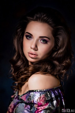 Photograph of a young woman with fair skin and wavy, dark brown hair styled in soft, voluminous waves. She has striking green eyes with bold, purple eyeshadow and thick, dark eyebrows. Her full lips are lightly glossed in a pinkish hue. She is wearing an off-the-shoulder top with a shimmering, multicolored pattern in shades of pink, purple, and silver. The background is a dark, gradient blue, which contrasts with her light skin and colorful top. The lighting highlights her facial features and the texture of her hair and top. Her expression is neutral, with a slight, enigmatic gaze directed at the camera.,fashion