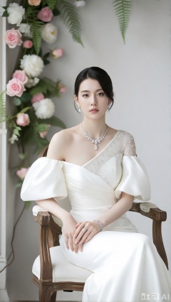 masterpiece, best quality, ultra-detailed, 8K resolution, 一位妆容精致气质高雅的亚洲女性,盘发发型,佩戴奢华珠宝(钻石项链、耳环、手链),身穿单肩设计的白色高级定制礼服,肩部镶满璀璨水钻,蓬松的绸缎袖口柔软有垂感,端坐在一张古典椅子上,姿态优雅端庄。背景是柔和的浅灰色墙面,装饰着粉色玫瑰、白色芍药与绿色蕨类枝叶的垂直花墙,虚化处理。室内柔光照明,光影柔和,突出珠宝的闪耀和礼服的光泽。整体色调以白色、淡粉色和香槟金为主,营造高贵、浪漫、梦幻的氛围。中心构图,时尚摄影风格,锐利焦点,细腻质感,柔焦背景,浅景深。