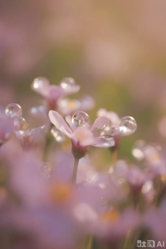Lighting art, macro photography, vibrant flowers, 1 dewdrop, focus dewdrop, selective focus, bokeh, morning, edge light, surreal, movie, meadow, contemporary art, close-up, soft light, warm light, enhanced details, leca camera, shiny, high quality, masterpiece, (no one)